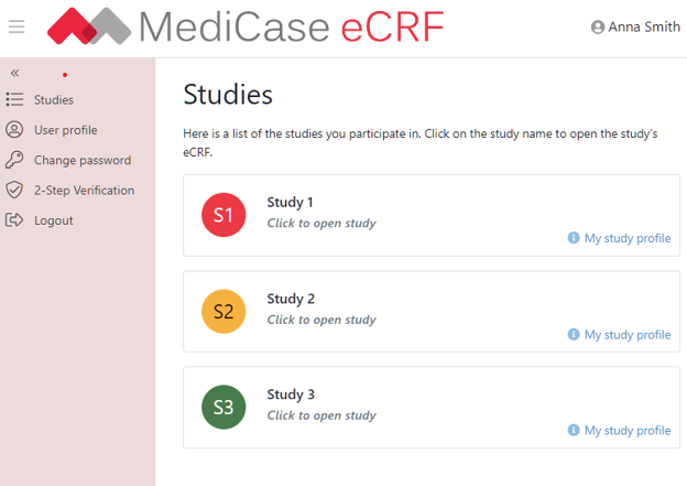 Once logged in, you can open the eCRF for the studies you participate in in the list of studies. In the left menu you find links to update your profile, change password and setup 2-Step verification. Here you can also logout from the site, including all studies you have open.